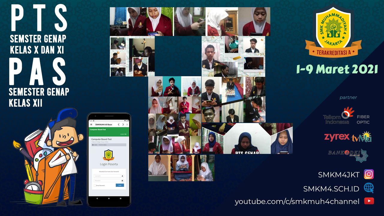 Alhamdulillah Penilaian Tengah Semester Kelas X dan Kelas XI secara daring di Sekolah SMK Muhammadiyah 4 Jakarta yang dilaksanakan selama 7 hari mulai tanggal 1-9 Maret 2021 berjalan dengan lancar. Kegiatan PTS juga berbarengan dengan pelaksanaan Penilaian Akhir Semester kelas XII yang dilaksanakan selama 5 hari mulai tanggal 1-5 Maret 2021 yang juga terlaksana secara Daring. Kedua kegiatan PTS dan PAS tidak ada kendala baik dari segi infrastruktur dan juga kendala oleh siswa.